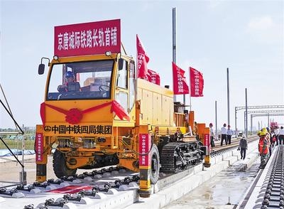 9月27日上午,无砟轨道铺轨机组拖拽着一对长轨缓缓前进,标志着京唐城际铁路开始铺轨施工。河北日报通讯员吴芝滨 摄