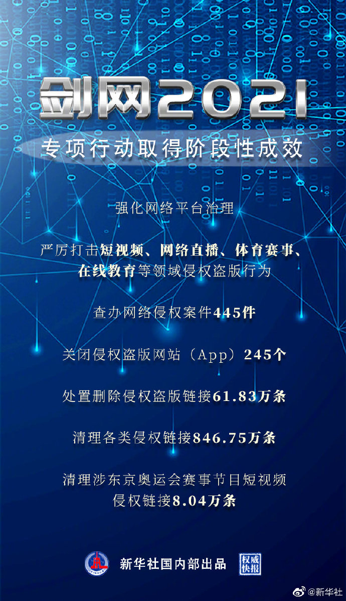 新华社北京9月28日电(记者史竞男)国家版权局、工业和信息化部、公安部、国家互联网信息办公室四部门今年6月联合启动打击网络侵权盗版“剑网2021”专项行动。截至目前,各级版权执法监管部门查办网络侵权案件445件,关闭侵权盗版网站(App)245个,处置删除侵权盗版链接61.83万条,推动网络视频、网络直播、电子商务等相关网络服务商清理各类侵权链接846.75万条,主要短视频平台清理涉东京奥运会赛事节目短视频侵权链接8.04万条。