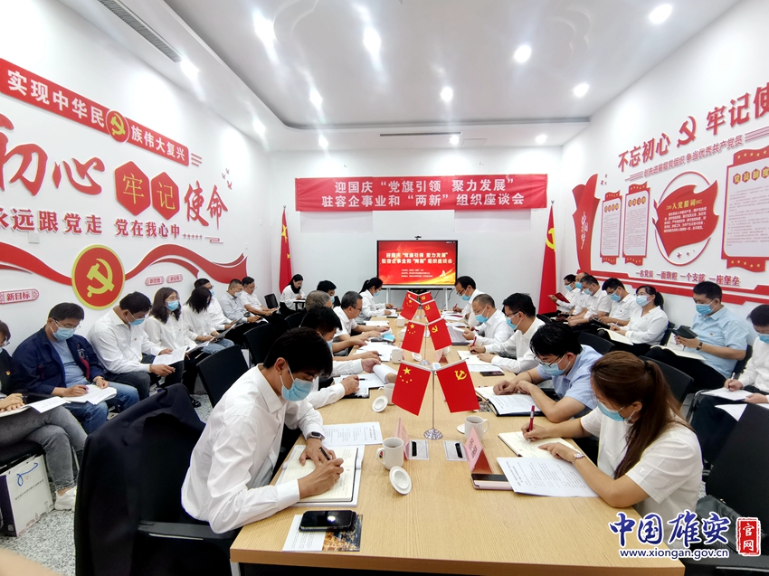 座谈会上,容城县“两新”组织企业代表进行了业务培训,参会代表就本单位党组织建设及驻容企事业单位和“两新”组织联席会议制度进行了讨论,雄安新区科技创新企业联合会秘书长董明德主持会议。最后,与会人员共唱《歌唱祖国》,庆祝祖国72岁生日。