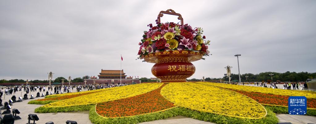 天安门广场中心的“祝福祖国”主题花坛,以喜庆的花果篮为主景,花篮内有太平花、榆叶梅、郁金香、百合花等40多种仿真花卉和水果,长安街沿线布置的10处主题花坛集中展示祖国各项发展的历史性成就。