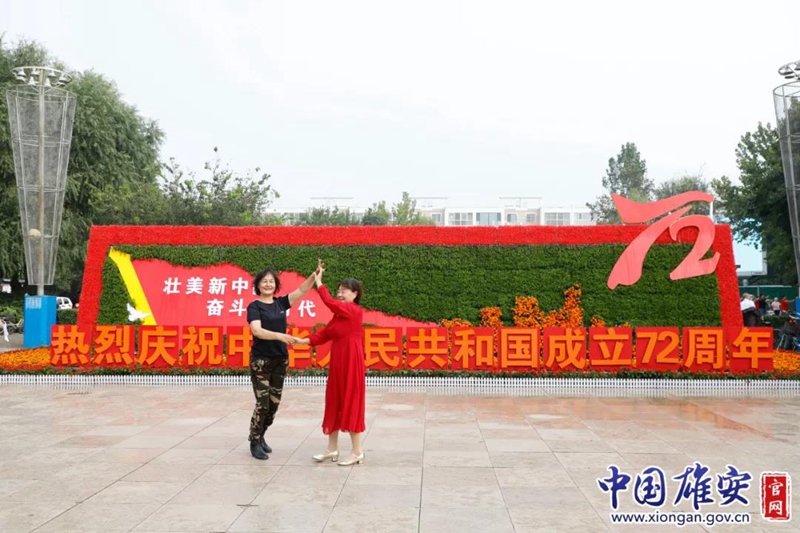 容城县新容花园,群众在花坛前起舞。中国雄安官网毛鹤然 摄