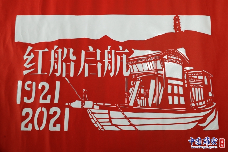 迎国庆,庆祝建党百年,张文龙创作了红色记忆系列剪纸作品。此为“红船启航”剪纸作品。实习生赵伟彤 摄