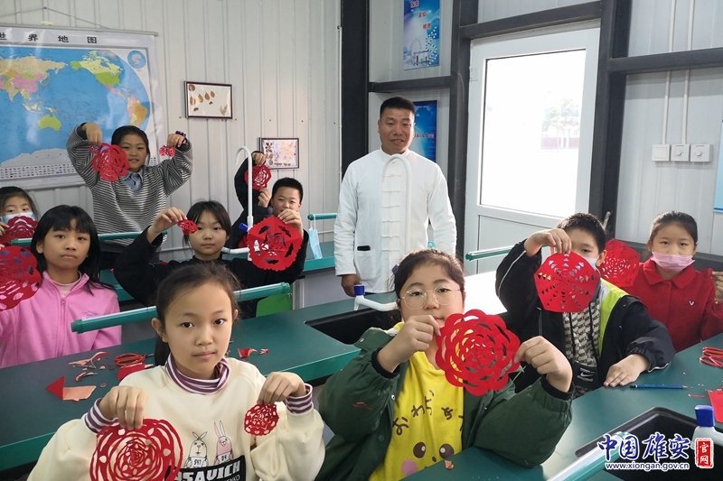 在国庆节前,张文龙受邀来到安新县第二小学,他带着提前准备好的剪纸材料,教孩子们如何折纸、构图、剪裁,让孩子们近距离感受家乡的剪纸文化。实习生赵伟彤 摄
