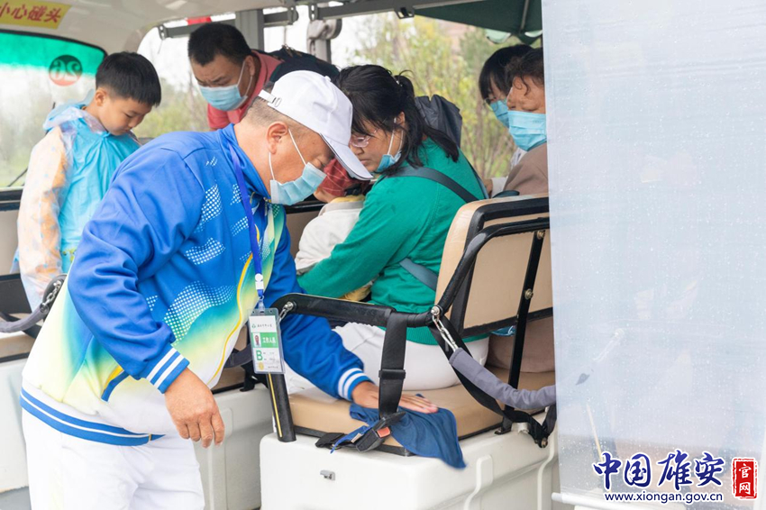 工作人员为游客擦去游览车座椅上的雨水。中国雄安官网毛鹤然 摄