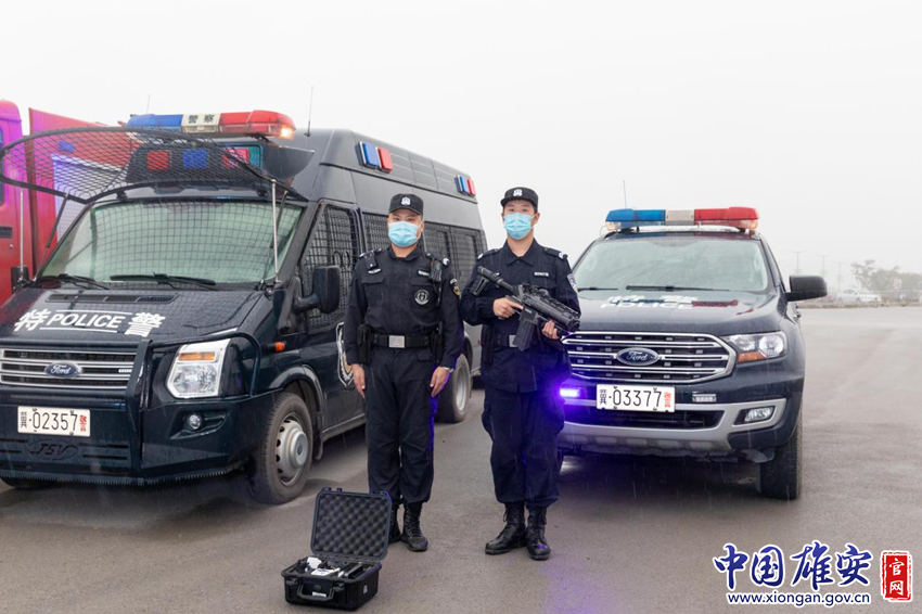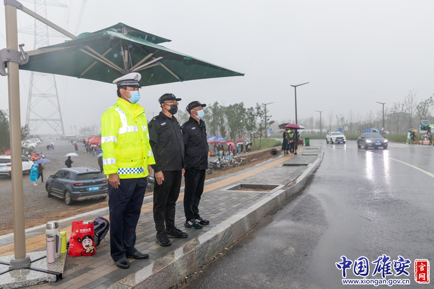 交警和保安在雨中坚守。中国雄安官网毛鹤然 摄