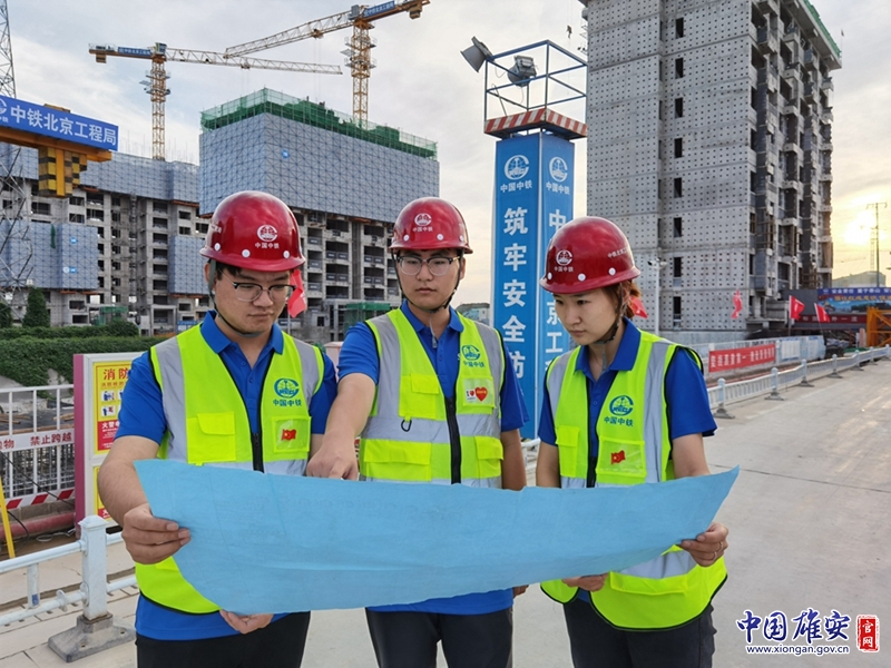 国庆期间,中铁北京工程局容西安置房A2标段项目建设者在施工现场研讨图纸节点做法。中国中铁供图