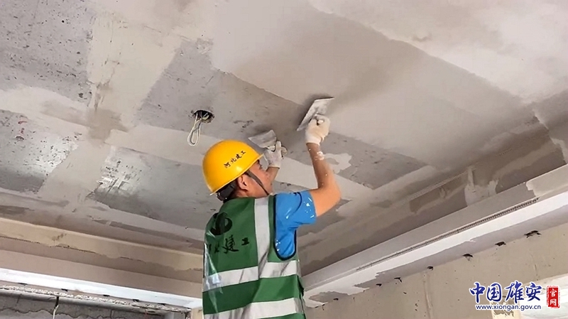 国庆期间,河北建工集团雄东片区A单元安置房项目二标段建设者在进行腻子施工。河北建工集团供图
