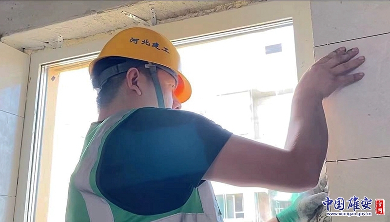 国庆期间,河北建工集团雄东片区A单元安置房项目二标段建设者在进行瓷砖粘贴工作。河北建工集团供图
