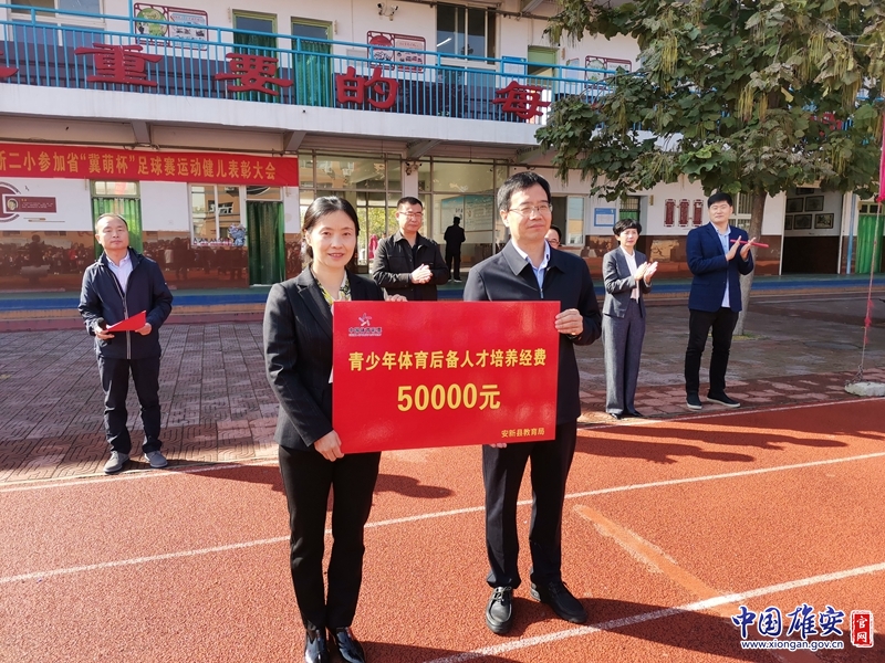 安新县教育局为安新县第二小学颁发青少年体育后备人才培养经费。中国雄安官网崔利杰 摄