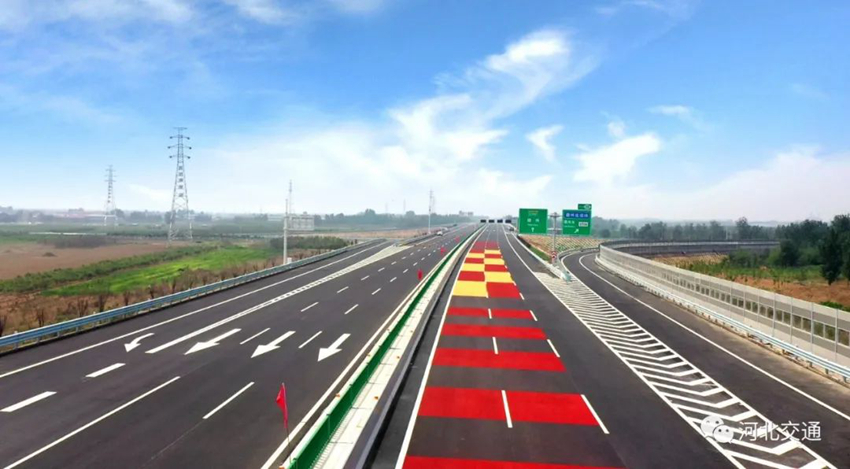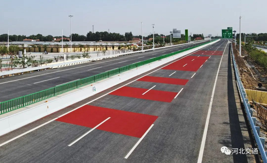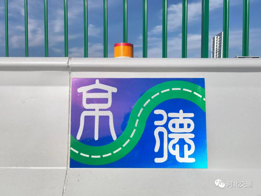行驶在京德高速上,能够看到各式各样的彩色路面,红黄蓝等多种颜色。在色调单一的高速公路上,通过多彩路面设计,给驾驶者以视觉上的冲击,舒缓疲劳还起到了警示提醒之效,成为京德高速上一道亮丽的风景线。此外,墙体彩绘也是京德高速的一大亮点。中国风彩色标也是多彩京德的重要组成部分,在京德高速全线的混凝土护栏上,张贴着小篆体和手画体京德反光标志,共四种样式分别为京德印章、路通京德、纵横之城、京门通衢,在夜晚形成一道反光灯条。颜色多采用代表规范的京德蓝,搭配的环保绿、和谐黄,使高速整体和谐自然,中国文化跃然于京德高速两侧。此外京德高速公路服务区还首次运用色彩丰富的视觉导视系统进行区域区分、车流引导。通过多彩京德的打造,让高速公路路面两旁的设施独具个性,不仅进一步增加了路面的安全性,也增加了司乘的驾驶趣味和体验。