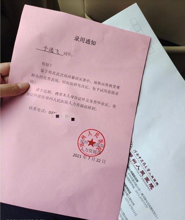 7月22日,郑州人民医院在了解于逸飞地铁救人的光荣事迹后,决定对于逸飞免试用直接录用。网友们纷纷点赞:恭喜医院招到了一位好医生。