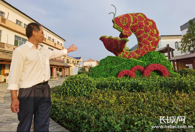 邵小贝向游客介绍村子里搭建的花坛。长城网记者吴苗苗 摄
