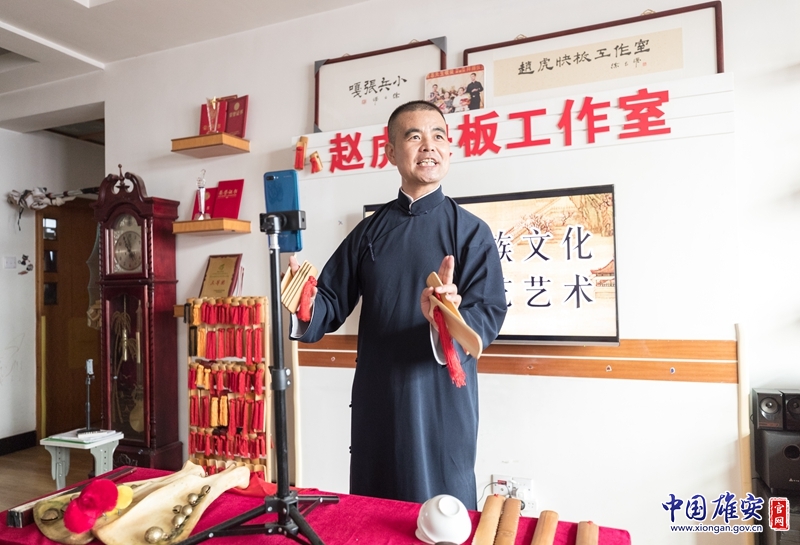 受父亲影响,赵虎自幼喜欢快板表演。“过去村里有宣传队,放电影之前要打快板,我小学一年级就闹着要玩快板。”人生必有痴,而后有成。从一个人“瞎摸索”,到2009年跟随快板表演艺术家常志先生学艺,再到2015年正式拜师,1978年生的赵虎凭借着对快板的爱好与追求,成为李派快板第四代传人。中国雄安官网李鑫 摄
