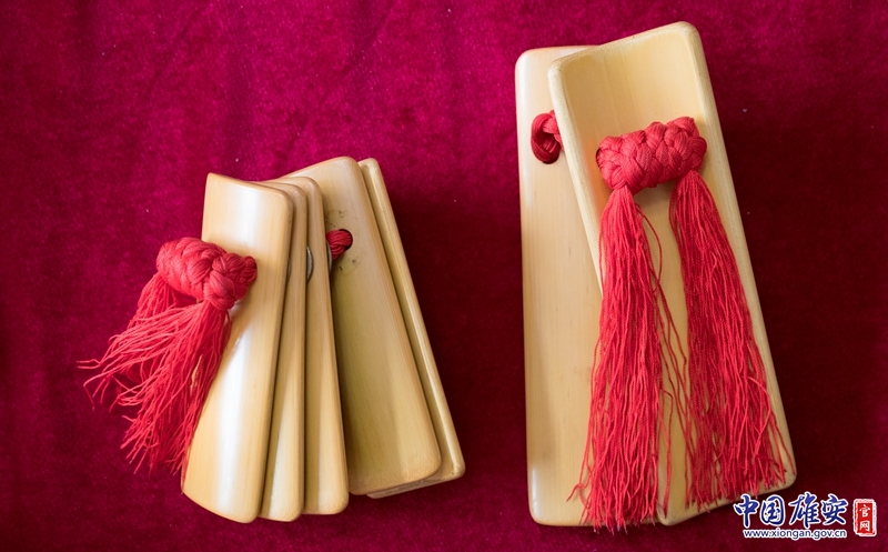 快板早年称作“数来宝”,主要有七块板、牛胯骨、三个碗、撒拉机、三块板等击节伴奏乐器,现在以七块板为主,包括两块大竹板和五块小竹板,又称大板(大蒯)和小板(节子)。赵虎介绍,快板分为王、高、李三派,李派以说书为主。中国雄安官网李鑫 摄