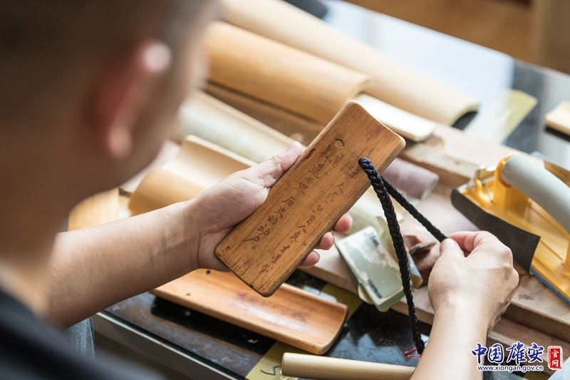 赵虎不仅打得一手好快板,还会制作快板。制作快板并不是一件容易的事情,需要挑选上好的竹料、裁定尺寸、打磨抛光、打孔、穿绳、拴板等一系列流程。“小板儿五块板,跟六个铜板垫片交错着,这么一缠……”在赵虎快板工作室里,他向记者讲解了快板制作的流程。“学员们使用的快板都是我亲手制作的。”赵虎说。中国雄安官网李鑫 摄