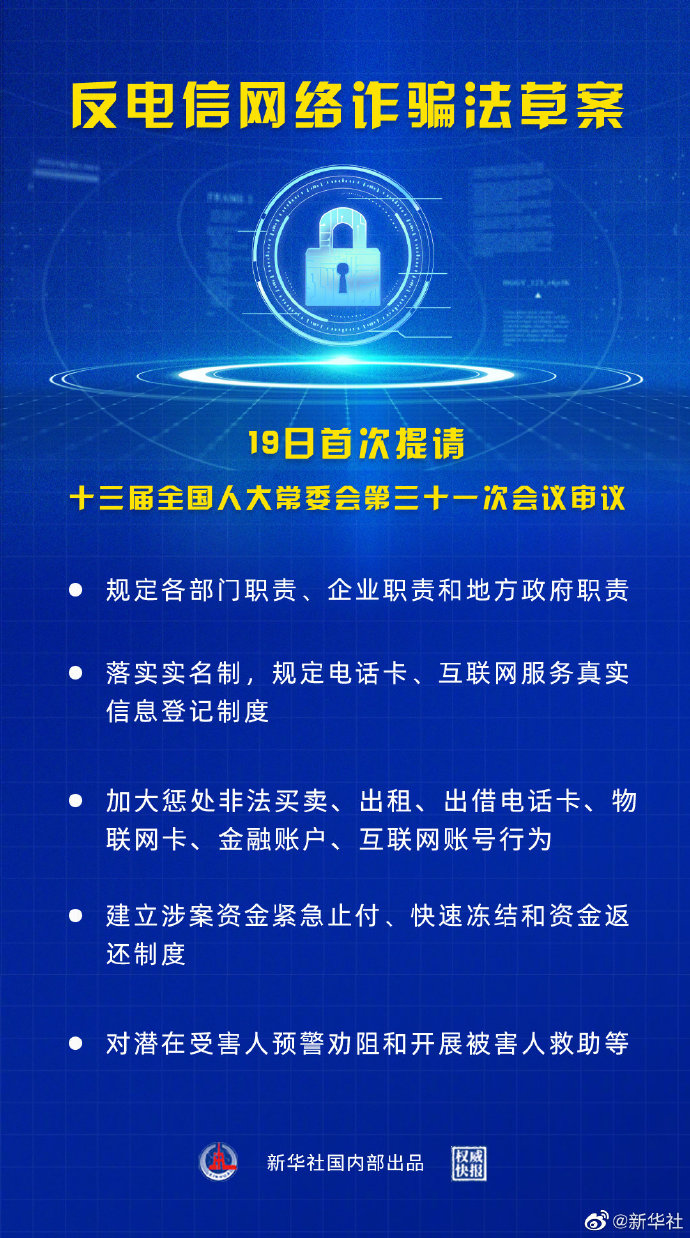 反电信网络诈骗法草案19日首次提请十三届全国人大常委会第三十一次会议审议。草案增强立法针对性、实用性、有效性,全面落实打防管控各项措施,规定反电信网络诈骗各部门职责、企业职责和地方政府职责;落实实名制,规定电话卡、互联网服务真实信息登记制度;加大惩处非法买卖、出租、出借电话卡、物联网卡、金融账户、互联网账号行为;建立涉案资金紧急止付、快速冻结和资金返还制度;对潜在受害人预警劝阻和开展被害人救助等。(记者熊丰,海报设计张晨光)