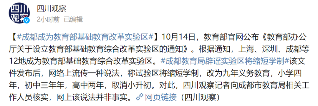 《教育部办公厅关于设立教育部基础教育综合改革实验区的通知》发布后,网传实验区将缩短学制等。对此,记者向成都市教育局相关工作人员核实,网上该说法并非事实。(四川观察微博)