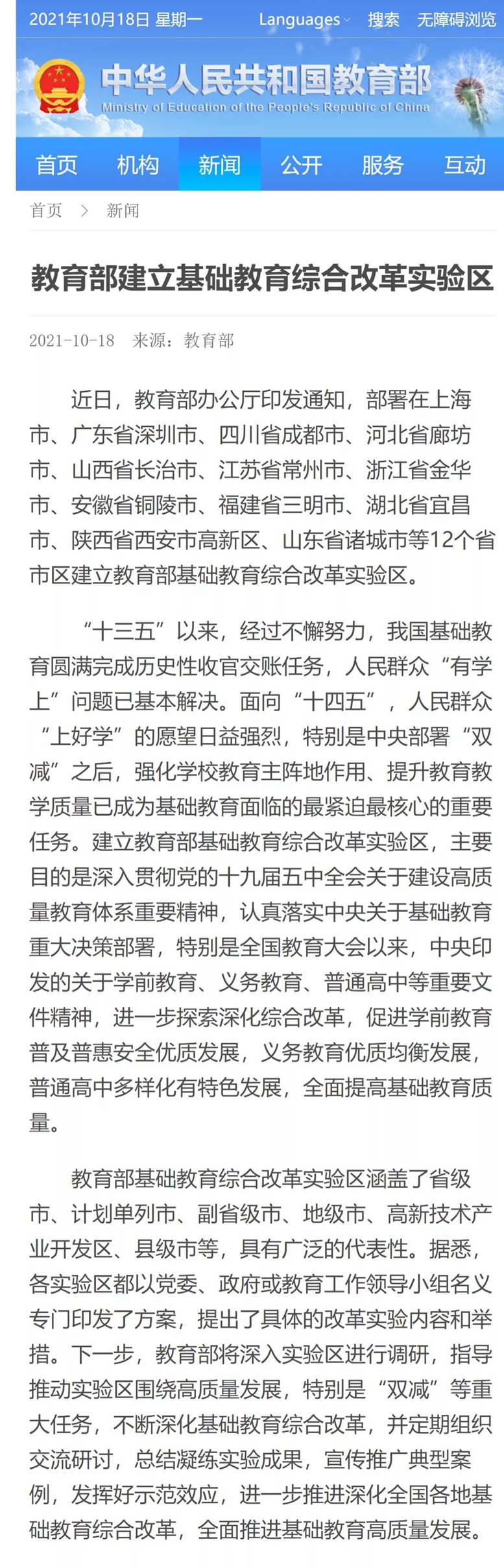 教育部就“建立基础教育综合改革实验区”进行权威发布