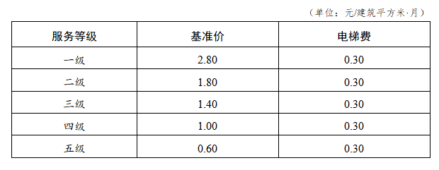 二、容东片区安置房前期物业服务执行四级服务标准,收费标准为1.30元/建筑平方米·月(含电梯费)。
