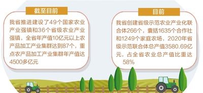积极培育农业产业化联合体,推动全产业链经营。目前,我省共创建省级示范农业产业化联合体266个,囊括1635个合作社和1249个家庭农场,2020年省级示范联合体总产值3580.69亿元,占全省农业总产值比重达58%,直接带动434万农户参与全产业链经营,户均增收5225元。