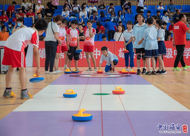 7月8日,雄县第三届冰雪运动会现场,学生正在投掷冰壶。(资料图)雄县教育局供图