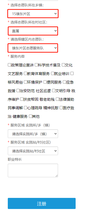 4.选择志愿者服务队:15雄东片区-雄东片区志愿者服务队,并填写其他信息点击注册,即可成为雄东片区志愿者。