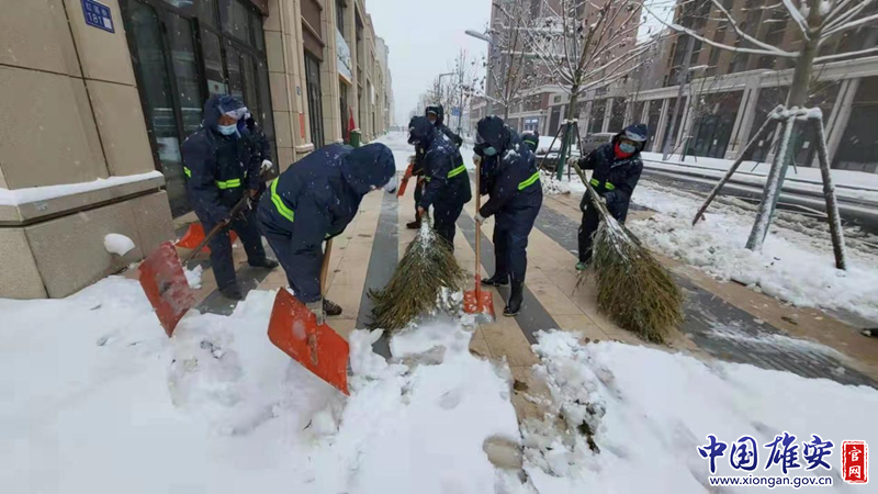 环卫作业队伍对人行道等公共区域进行除雪。雄安集团生态建设投资公司供图
