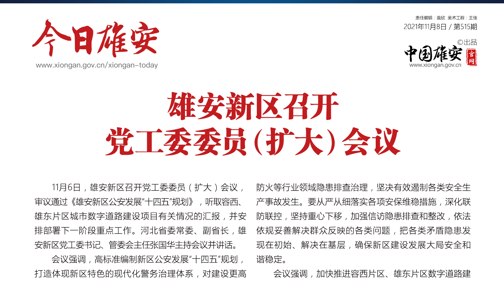 11月6日,雄安新区召开党工委委员(扩大)会议,审议通过《雄安新区公安发展“十四五”规划》,听取容西、雄东片区城市数字道路建设项目有关情况的汇报,并安排部署下一阶段重点工作。河北省委常委、副省长,雄安新区党工委书记、管委会主任张国华主持会议并讲话。会议强调,要把握新时代公安工作职责使命,推进更高水平的平安新区建设,为迎接党的十九届六中全会召开创造安全稳定环境。