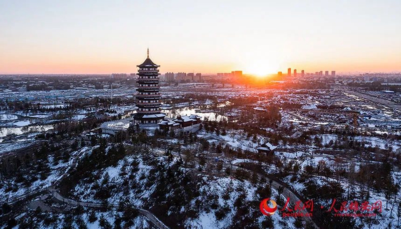 傍晚时分,航拍雪后白洋淀码头。人民网宋烨文 摄