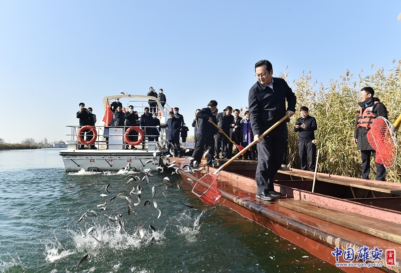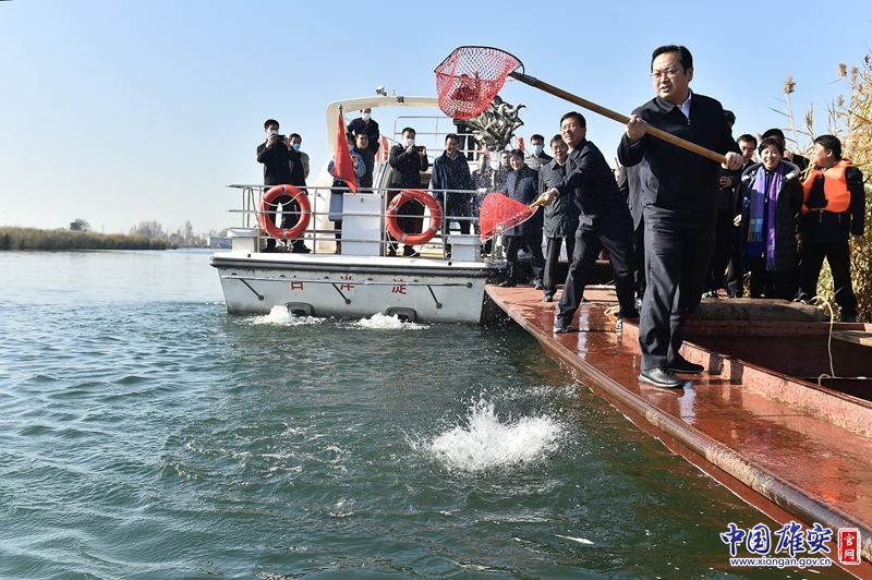天朗气清,碧波荡漾,白洋淀内鱼鹰、野鸭自由嬉戏,勾勒出一幅美丽的华北水乡画卷。行程中,张国华一行共同将此次放流的鱼苗投放至白洋淀水中,为冬日的白洋淀再添生机活力。张国华强调,在白洋淀进行增殖放流对于改善白洋淀水域环境,保护白洋淀生物多样性具有重要作用。要持续开展白洋淀生态环境修复,优化白洋淀生态系统结构,加快恢复原生水生植被,促进水生动物增殖和种类增加,切实增强白洋淀的自我生态修复能力。要不断完善白洋淀水域生态治理和保护措施,创新生态环境保护方式,常态化开展水生生物监测和外来物种巡查防治,维护白洋淀水生态安全。要积极引导全社会树立生态文明意识,培育生态文化,让保护白洋淀、热爱白洋淀成为新区广大干部群众的共同责任和自觉行动,推动形成人与自然和谐发展现代化建设新格局。