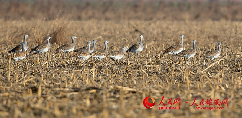 大鸨是国家一级重点保护野生动物,属于鹤形目,鸨科的大型地栖鸟类,翅长超过400毫米,被列入《世界自然保护联盟濒危物种红色名录》和《中国濒危动物红皮书》。据相关记载,大鸨在我国现存约几百只。据介绍,此次观测到的大鸨共有38只。这已经是大鸨连续16次来到雄安新区越冬。