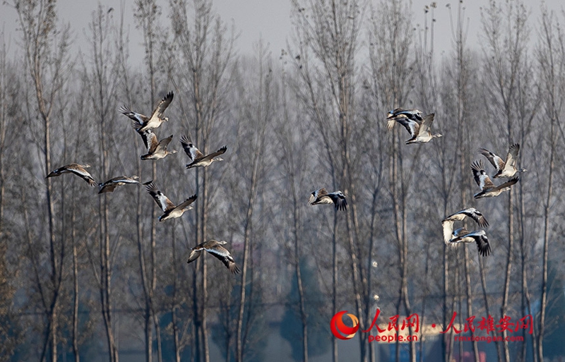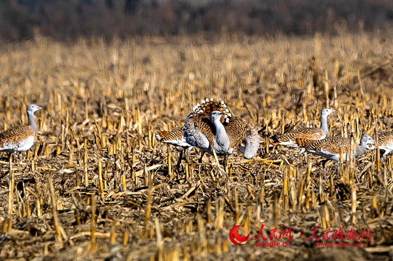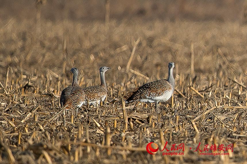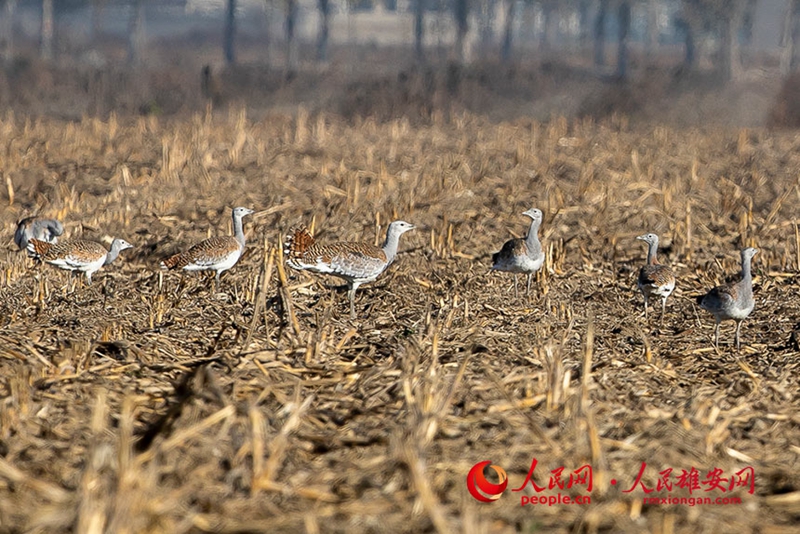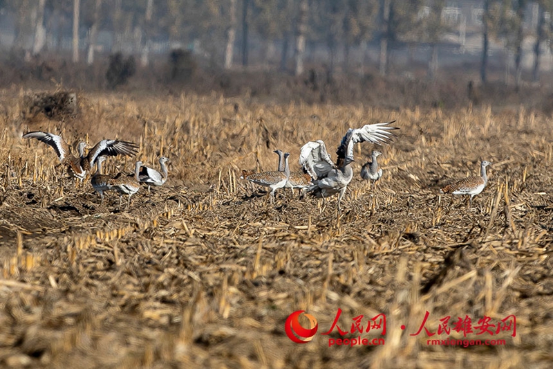 国家一级保护野生动物大鸨来雄安越冬了!11月14日,雄安新区安新县当地的爱鸟人士在一片田地里观测到了一群正在觅食的大鸨。它们时而四处张望,时而低头吃食,时而扑扇翅膀飞向天空,显得非常自在悠闲。