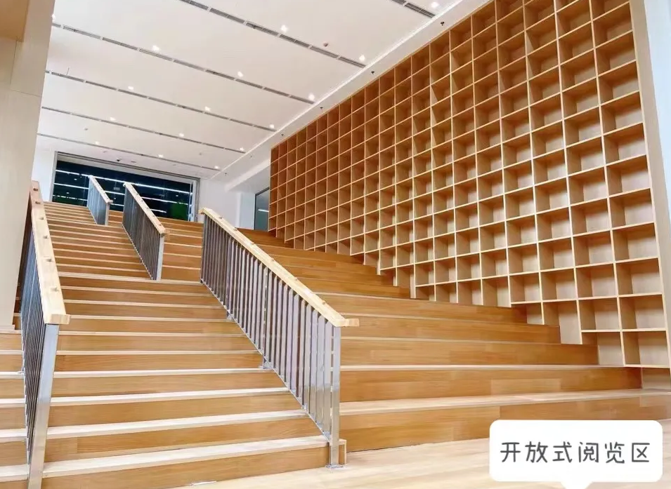 一整面墙的书架,看起来好震撼啊!这可以摆放多少我爱看的图书呀,听说这里还能全班看电影,老师会放我爱看的奥特曼吗?