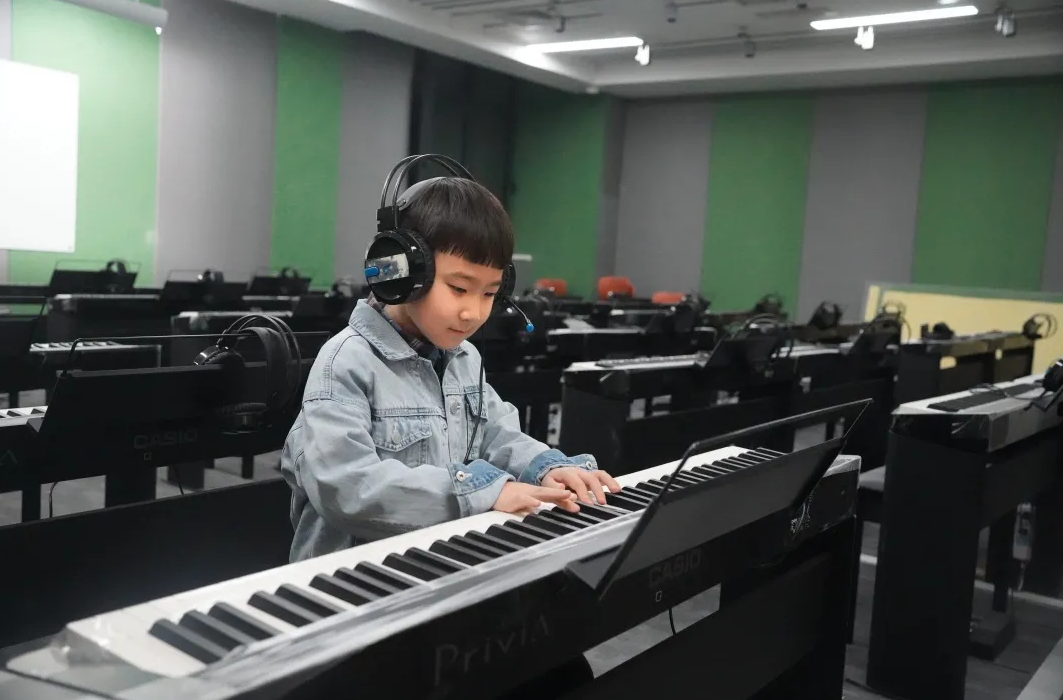 地下还有许多专用教室,那我一定要去感受一下,爸爸,我们快去看看。瞧,我弹琴的样子很帅吧,这么多的电钢琴,以后我的同学们都可以成为“小小钢琴家”啦!