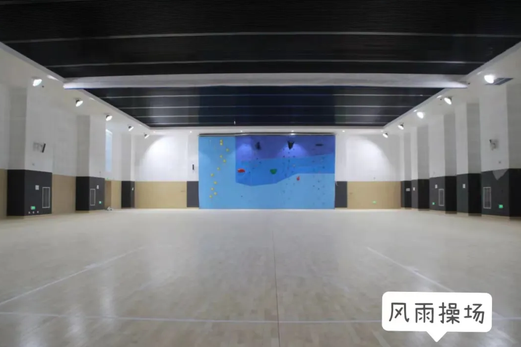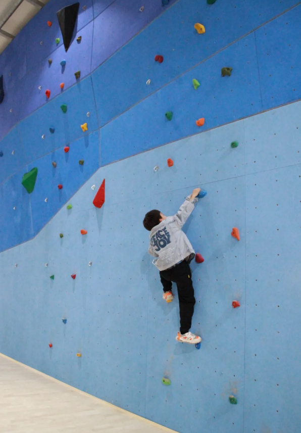 哇,这面蓝色的墙是什么?原来这是攀岩墙,爸爸,你快帮帮我,我要爬上顶峰。