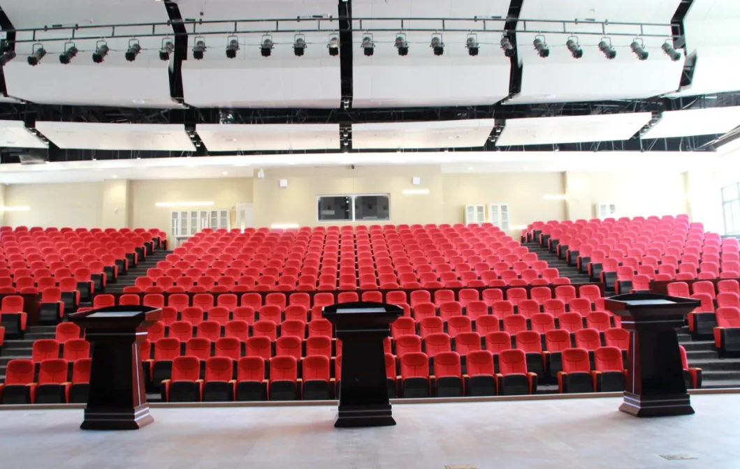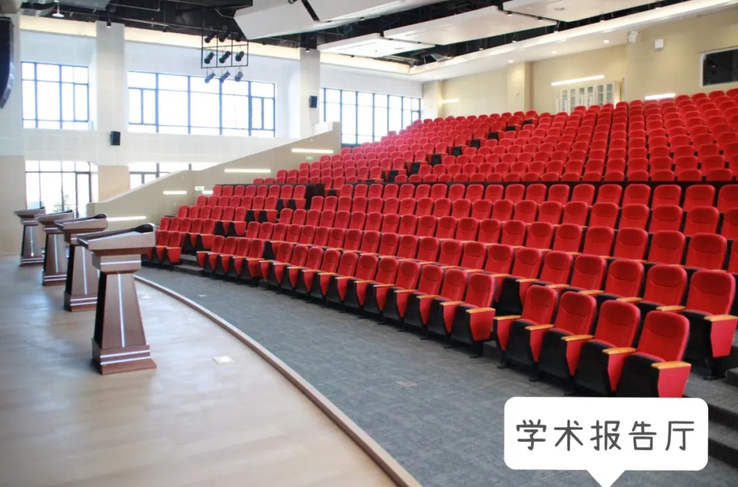 这么宽大的报告厅是以后我们一起演出的地方,舞台上的灯光可亮了,还可以跟着音乐不停变换呢,以后我们“六一”儿童节就可以在这里表演节目啦。
