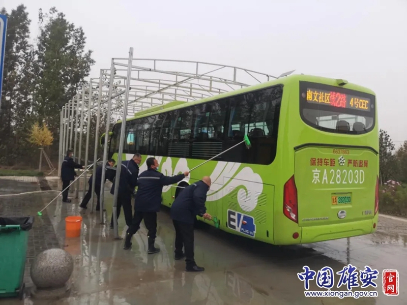 提前完成今天工作的2路车停靠在了洗车点,工作人员正在为它做“美容”。“到收车的时候,每隔15分钟左右就会有一辆车回来。还好洗车的人多点,要不还真干不过来。”正在洗车的王宾说,下辆车进来前,得把现在这辆车洗完,第二天每辆车就又可以以崭新的面貌继续迎接乘客了。中国雄安集团交通公司供图
