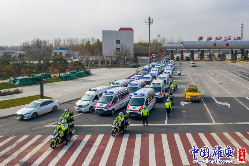 警车开道、铁骑护卫,迎接雄安新区支援辛集市负压救护车队回家。雄安新区公共服务局供图