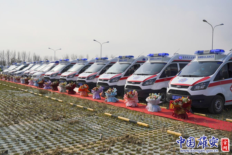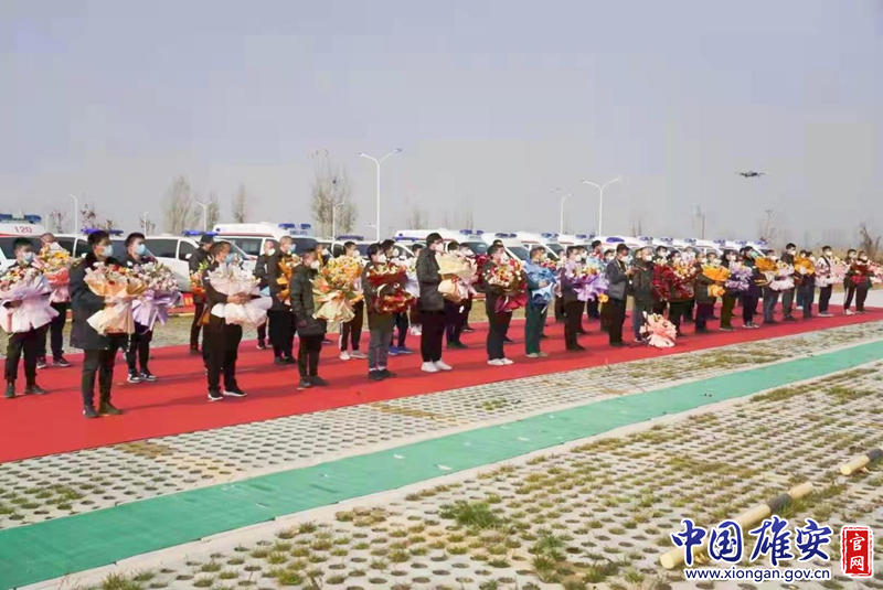 雄安新区支援辛集市负压救护车队载誉归来欢迎仪式现场。雄安新区公共服务局供图