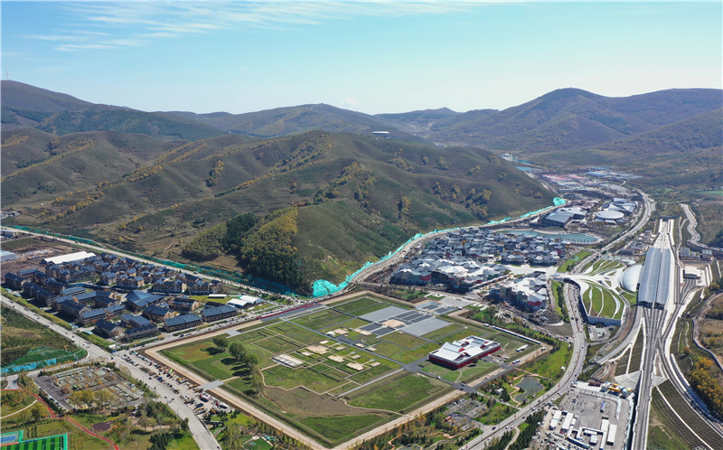 9月27日拍摄的张家口奥运村(左)、崇礼太子城冰雪小镇(中)和高铁太子城站(无人机照片)。新华社记者杨世尧 摄
