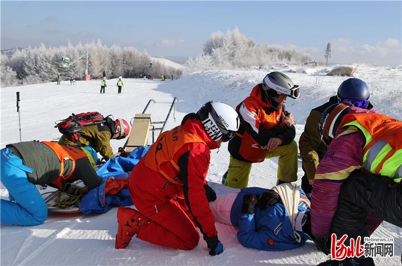 在张家口市崇礼区万龙滑雪场,冬奥滑雪医疗保障“梦之队”云顶队河北队员在进行雪道医疗救护演练。(河北日报资料片)河北日报记者贾恒 摄