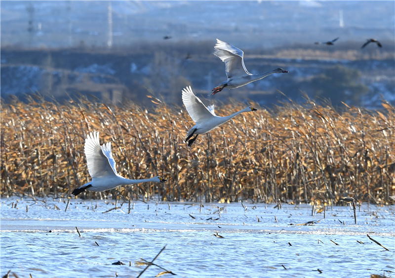 11月13日,三只天鹅在怀来县官厅水库国家湿地公园飞舞。