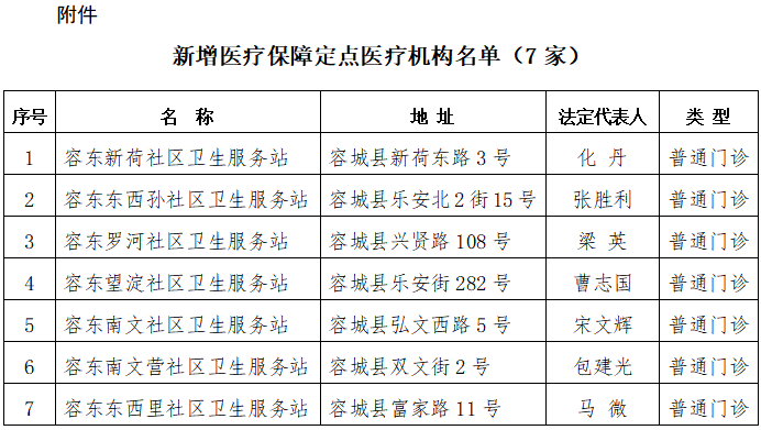 根据《河北省医疗保障定点医疗机构协议管理办法(试行)》(冀医保规〔2019〕1号)《河北省医疗保障定点医药机构纳入实施细则(试行)》(冀医保规〔2020〕4号)等有关规定,遵循公开、公正、公平的原则,经综合考察评估、公示、培训考试及协商谈判等环节,确定容东片区容东新荷社区卫生服务站等7家医疗机构纳入雄安新区医疗保障定点协议管理范围,现予以公告。