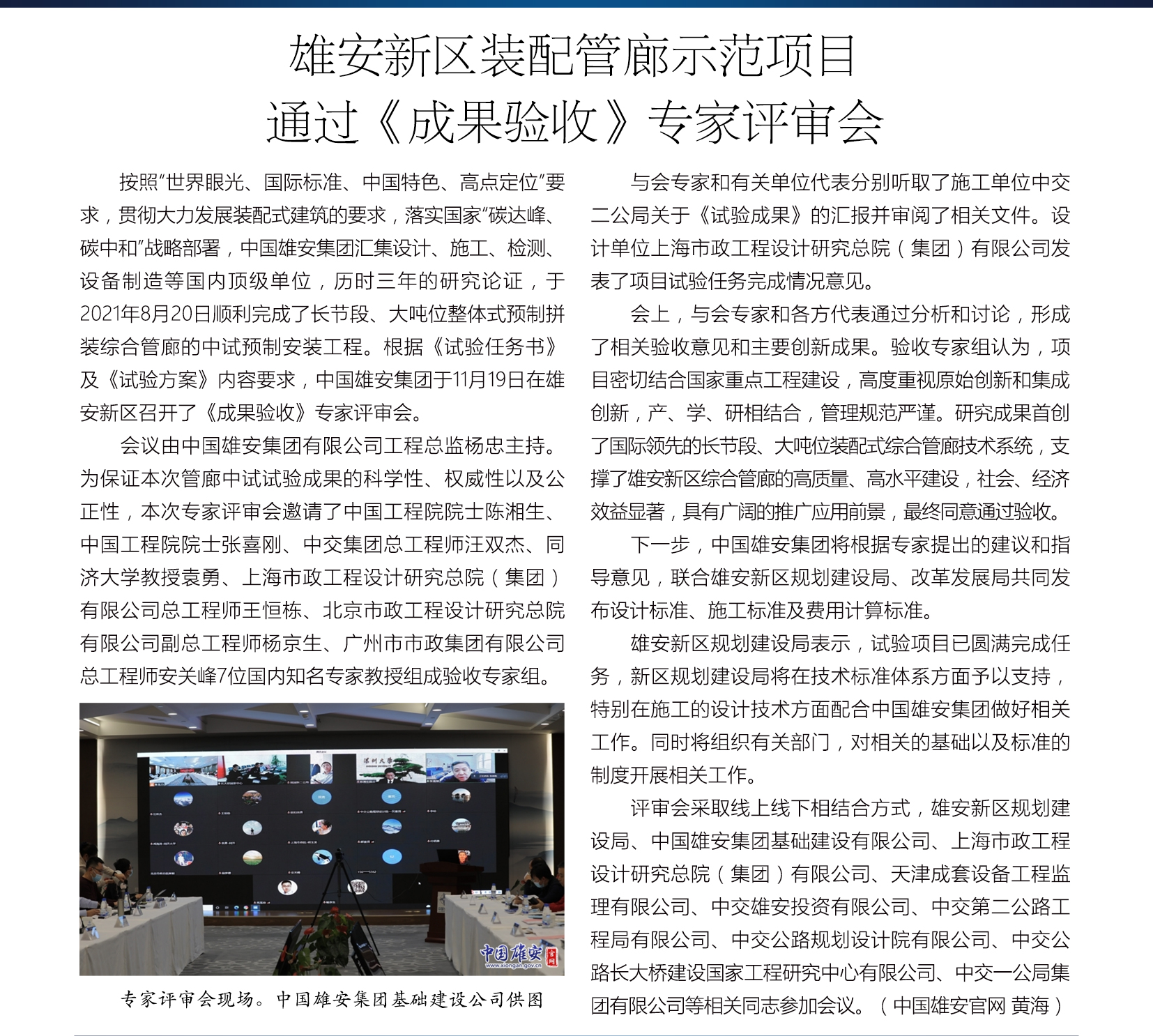 雄安新区装配管廊示范项目通过《成果验收》专家评审会