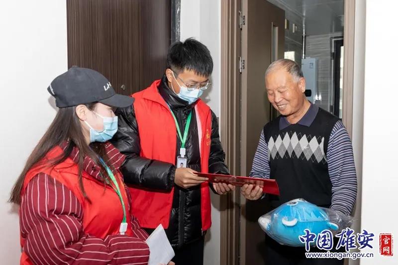 容东片区望淀社区的工作人员向刘志安送上毛绒玩偶,并为其讲解入住相关注意事项。中国雄安官网毛鹤然 摄
