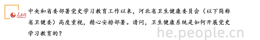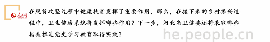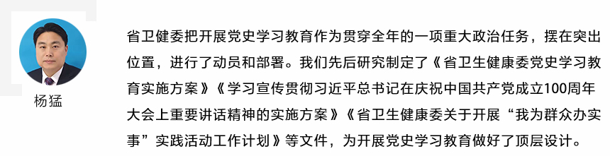 日前,河北省卫生健康委主任杨猛接受了人民网专访,围绕卫生健康系统如何开展党史学习教育、如何推进“我为群众办实事”,如何当好人民群众的健康卫士等话题进行了深入地交流。