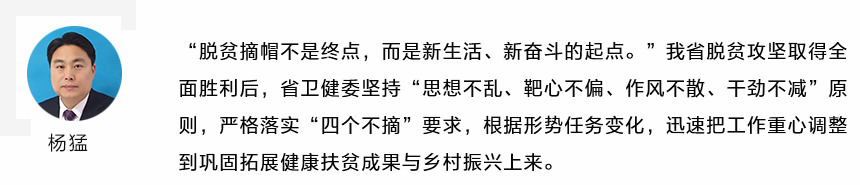 我们结合工作实际,及时成立巩固拓展健康扶贫成果领导小组,会同省有关部门制发《巩固拓展健康扶贫成果同乡村振兴有效衔接的实施方案》,为做好巩固拓展工作提供了政策依据和工作遵循。同时,我们以党史学习教育“我为群众办实事”为抓手,细致梳理工作任务,完善工作措施,对巩固健康扶贫成果开展“回头看”和后评估工作,全力为群众提供全方位全生命周期的健康服务,为脱贫地区接续推进乡村振兴提供坚实健康保障。