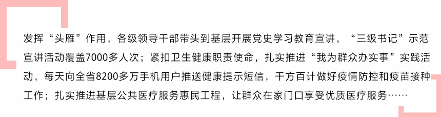 我们注重发挥“头雁”作用,各级领导干部带头到基层医院开展党史学习教育宣讲和习近平总书记“七一”重要讲话精神宣讲,“三级书记”示范宣讲活动覆盖7000多人次……