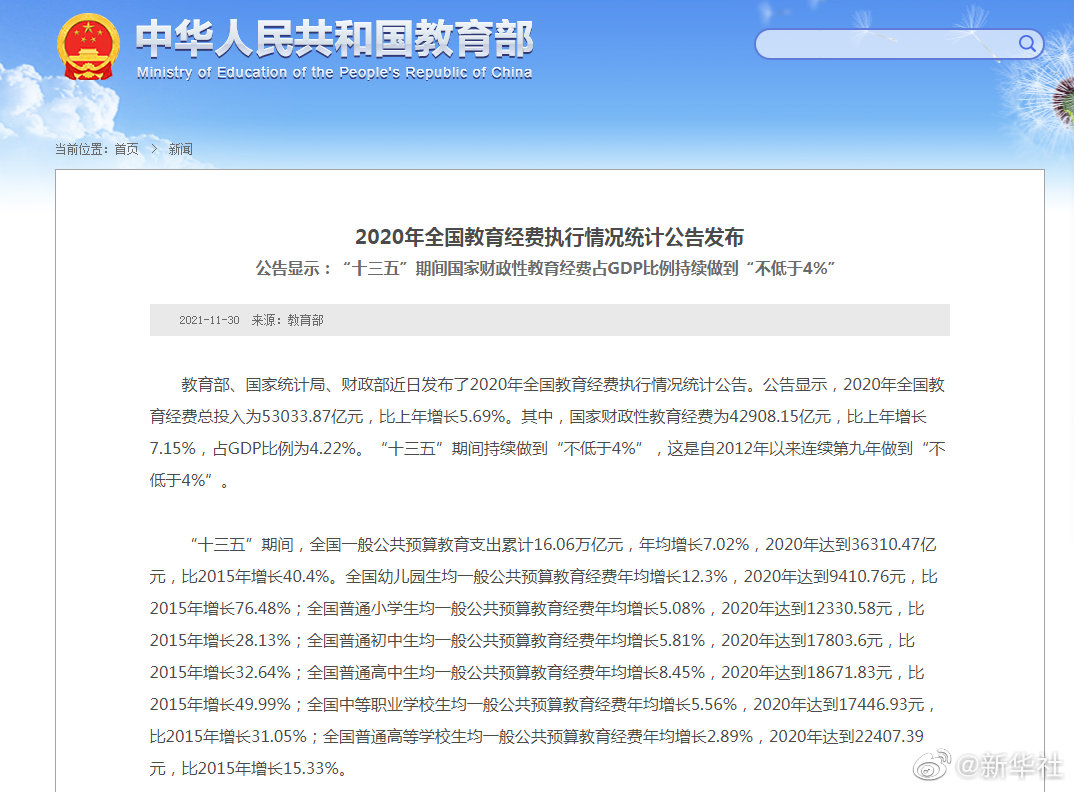 记者11月30日从教育部网站了解到,2020年全国教育经费总投入为53033.87亿元,比上年增长5.69%。其中,国家财政性教育经费为42908.15亿元,比上年增长7.15%,占GDP比例为4.22%。这是自2012年以来连续第九年做到“不低于4%”。(记者 王鹏)