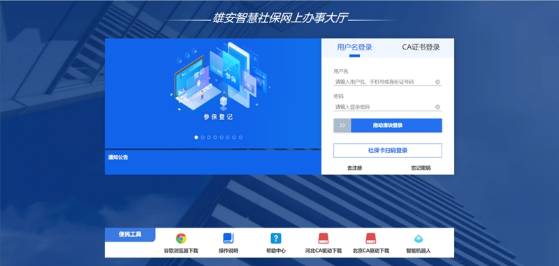 “雄安智慧社保网上办事大厅”登录页面。中国雄安官网发